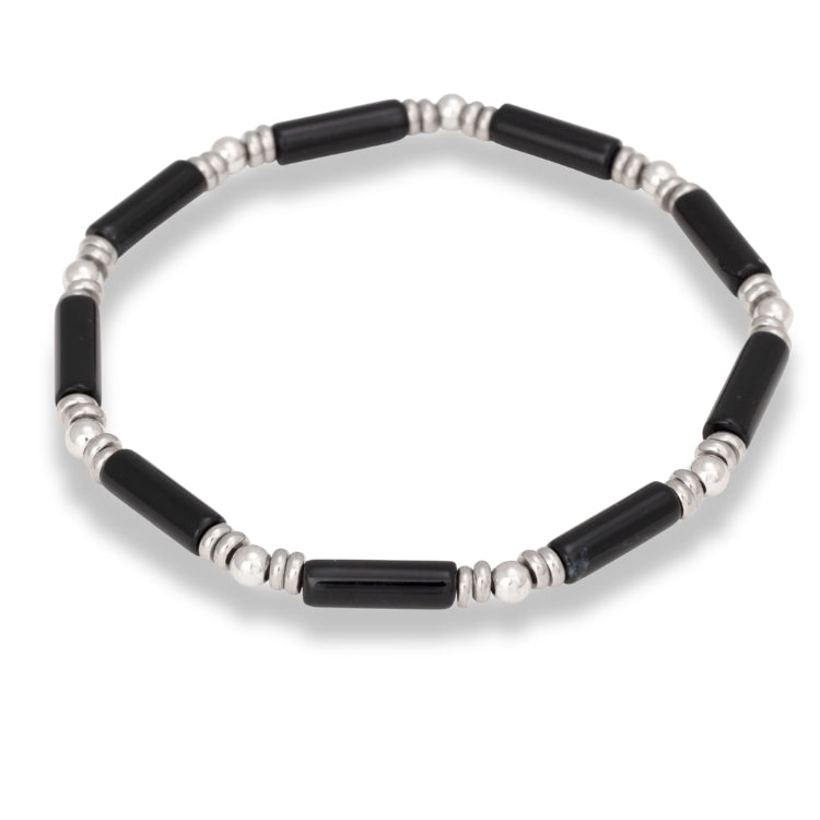 Ett elastiskt armband med svarta onyxädelstenar, smakfullt kombinerat med små kulor i rostfritt stål. En stilren accessoar där subtila detaljer lyfter helheten med elegans. Bredd: 4 mmLängd: 19 cm