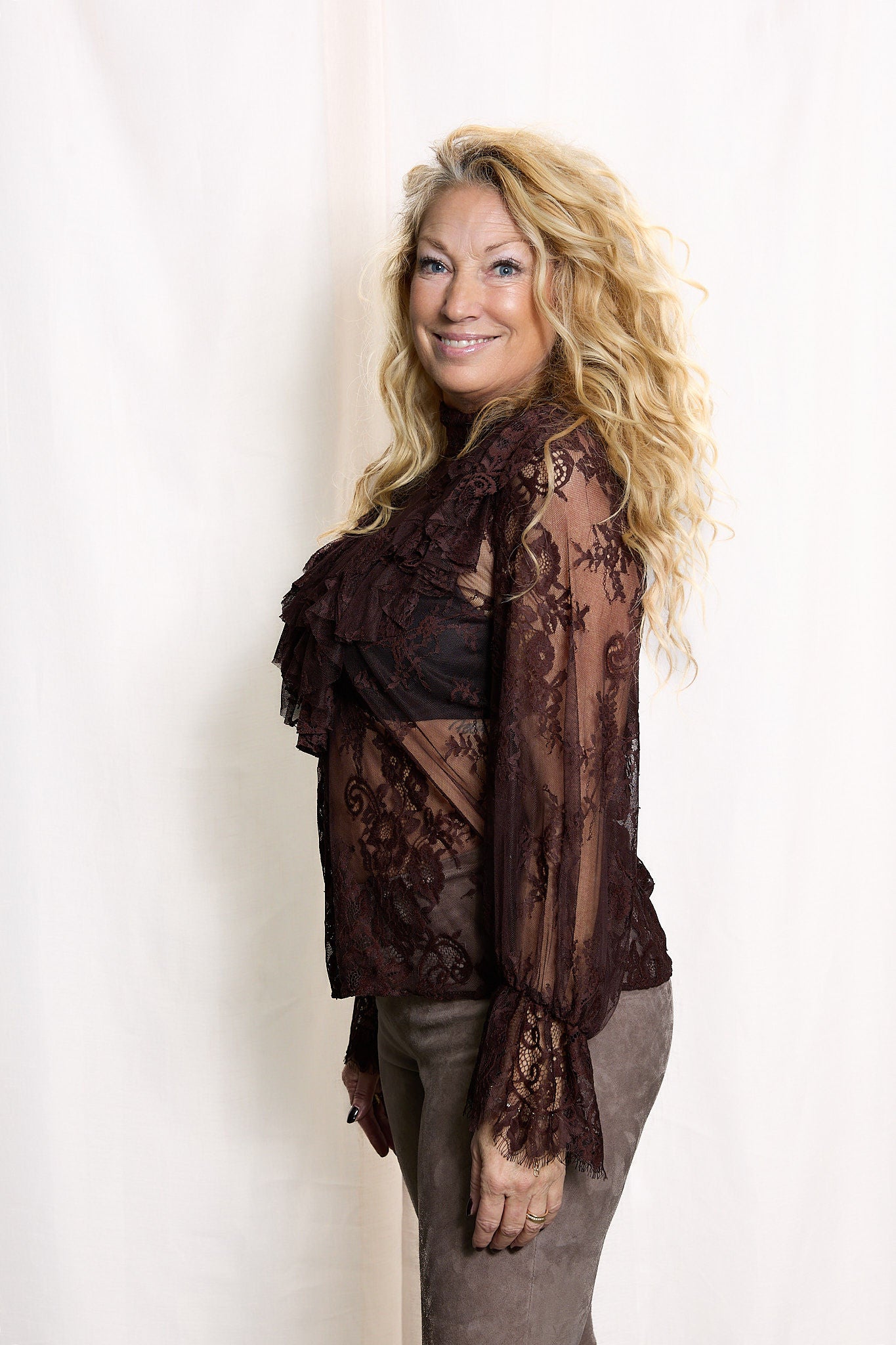 Denna spetstopp från Vicolo är en elegant och feminin blus i brun, transparent spets. Modellen har en hög halsringning med dekorativ spetskant som ger ett sofistikerat uttryck. Toppen är långärmad med lätt utsvängda ärmslut.