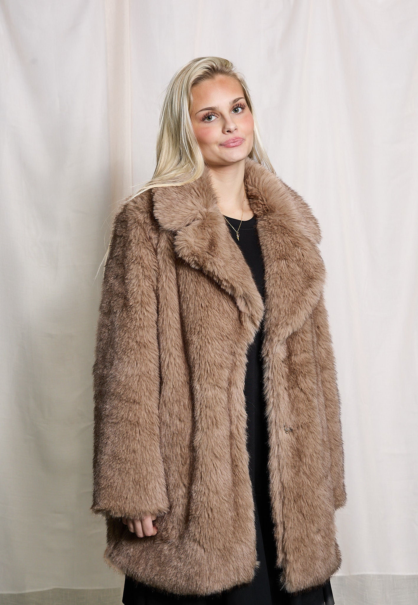Celine är en elegant jacka i mjuk fuskpäls som kombinerar lyxig komfort med tidlös design. Med sin smickrande passform, diskreta knäppning och helfodrade insida är den perfekt både till vardags och fest. Praktiska fickor och långa ärmar gör den till ett stilrent och funktionellt val, en jacka du alltid vill ha nära till hands.