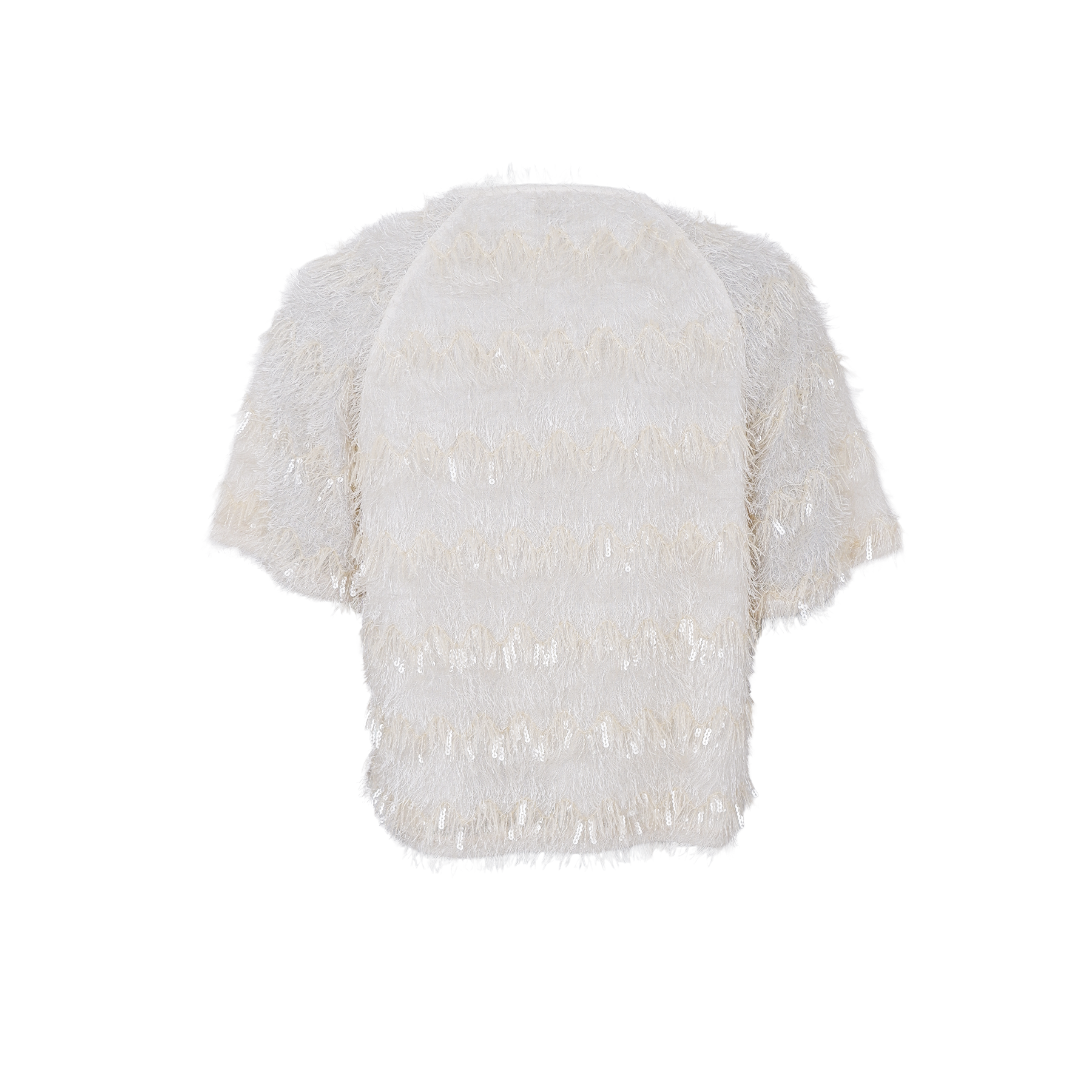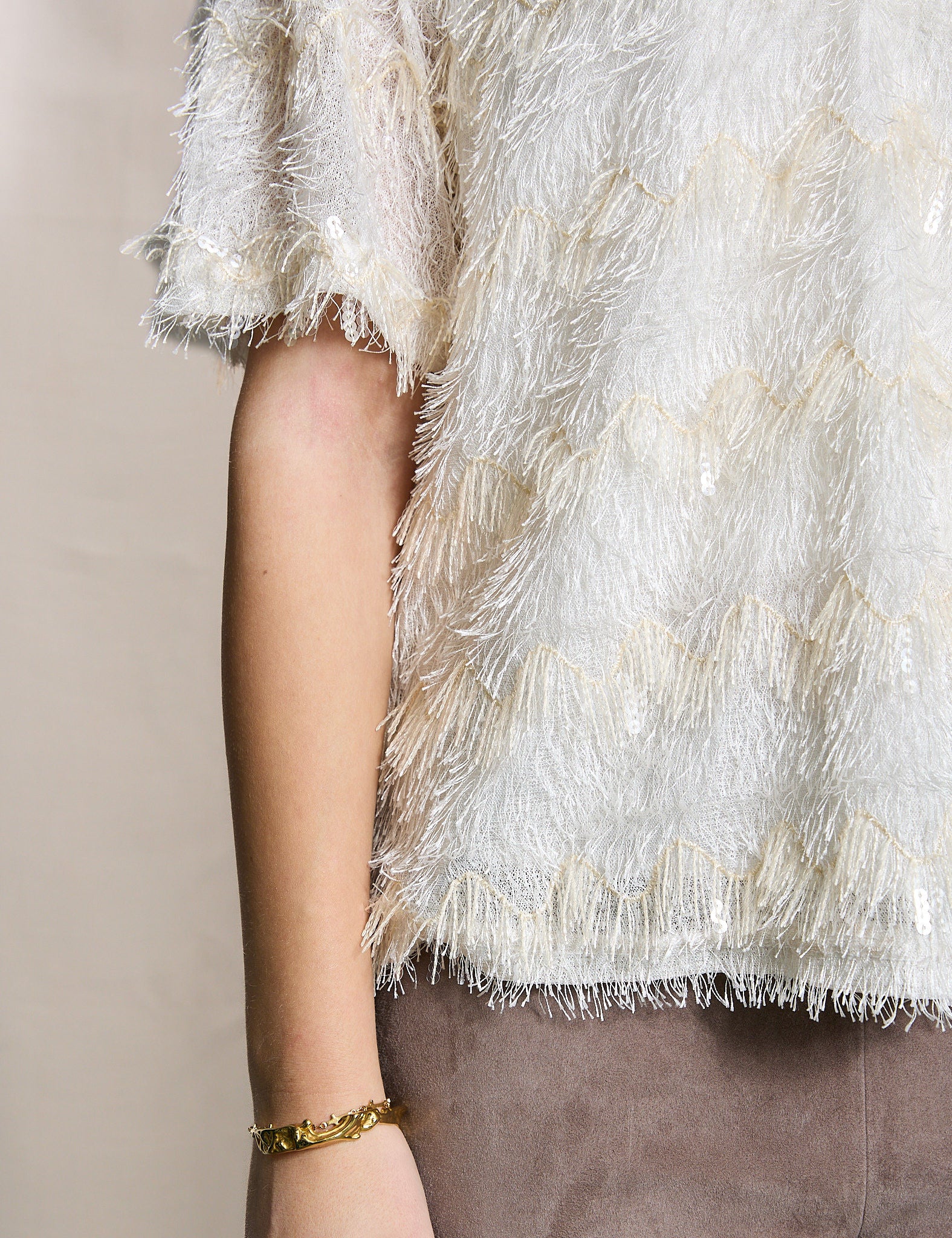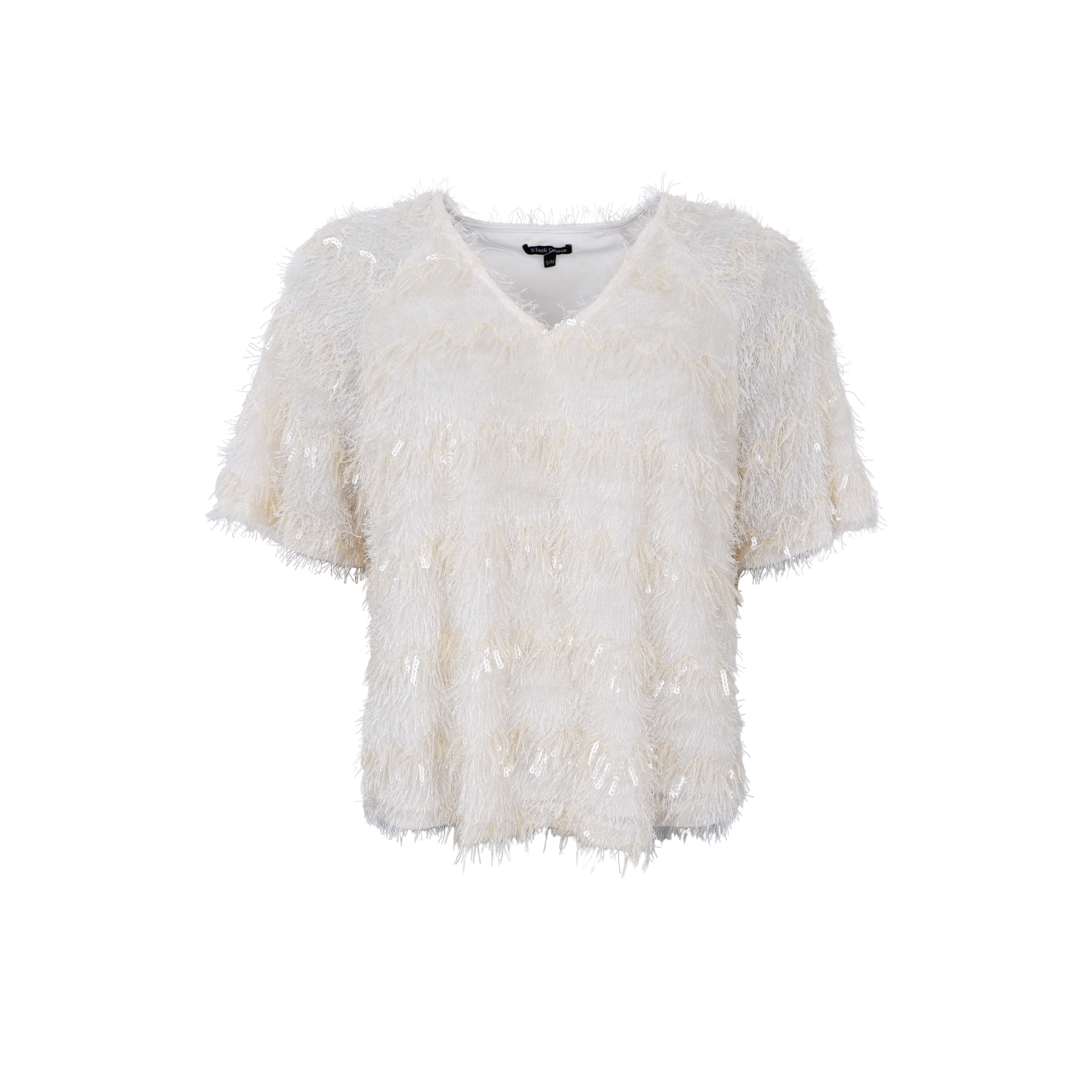 Fitz blusen är dekorerad med fransar och paljetter som ger en exklusiv look. Med en feminin V-ringning, korta ärmar och en lätt, avslappnad form är den både stilren och bekväm. Perfekt för festliga tillfällen.