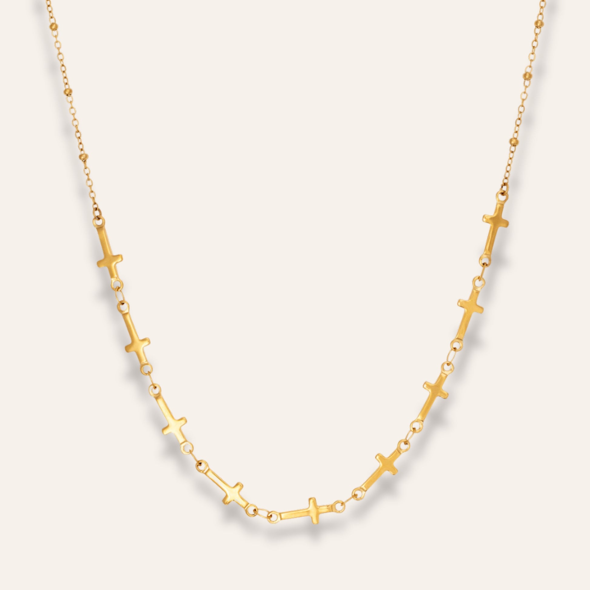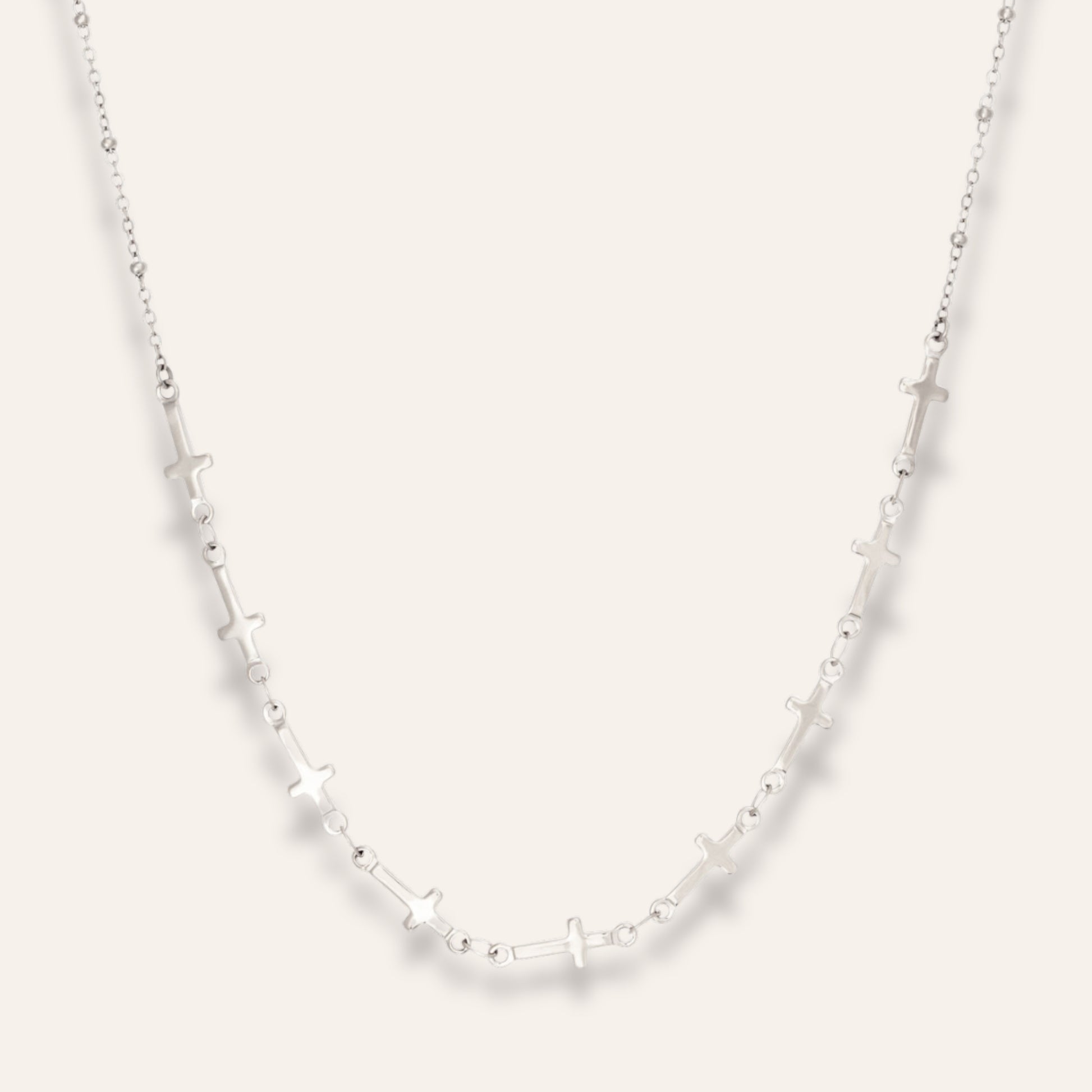 Upptäck tidlös elegans med ett stilrent korshalsband i högkvalitativt och vattentåligt rostfritt stål. Den minimalistiska designen gör det till en perfekt accessoar för både vardag och fest. Halsbandet är 40 cm och är utrustat med en 5 cm förlängningskedja, vilket ger möjlighet att anpassa passformen efter önskemål och stil.