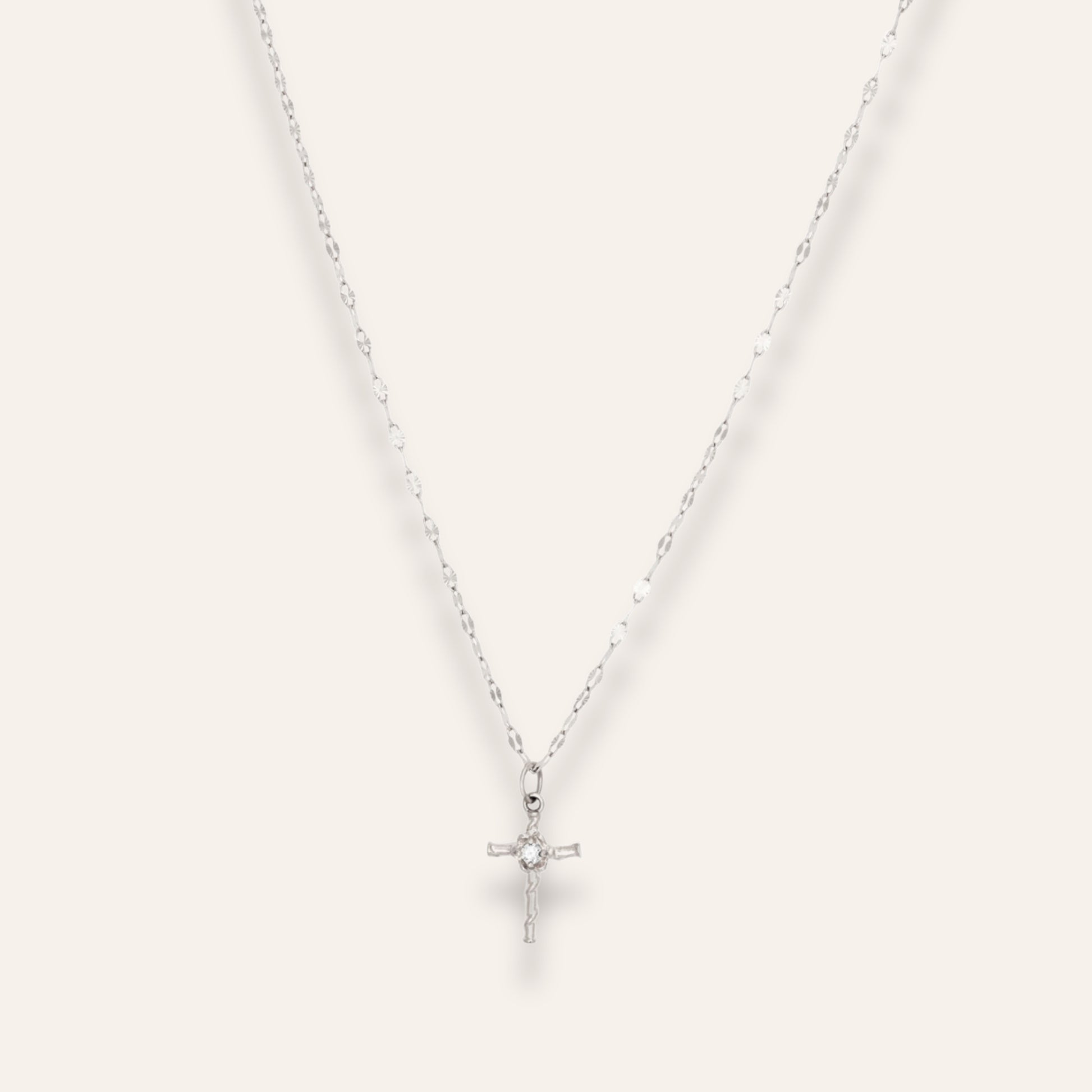 Tidlös elegans möter modern design i detta stilrena korshalsband, tillverkat i högkvalitativt och vattentåligt rostfritt stål. Det enkla korset är dekorerat med en zirco sten i mitten, en subtil men sofistikerad detalj som fångar ljuset på ett elegant sätt.