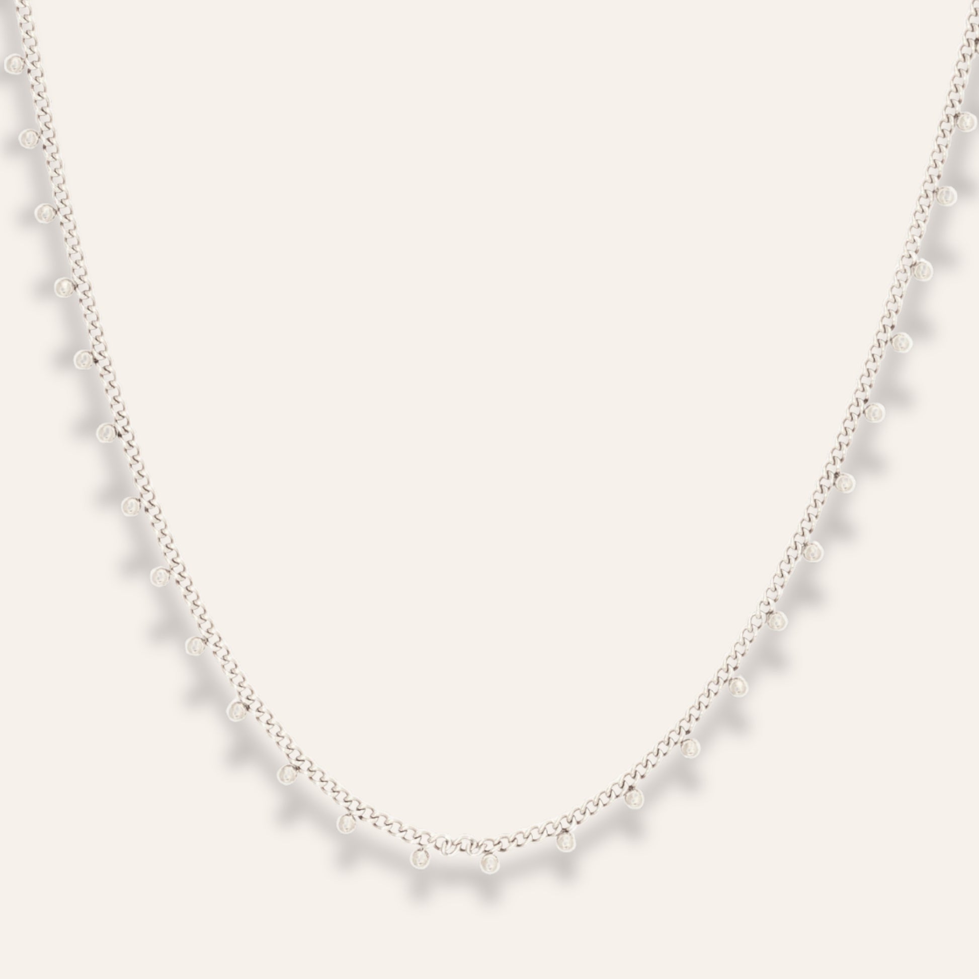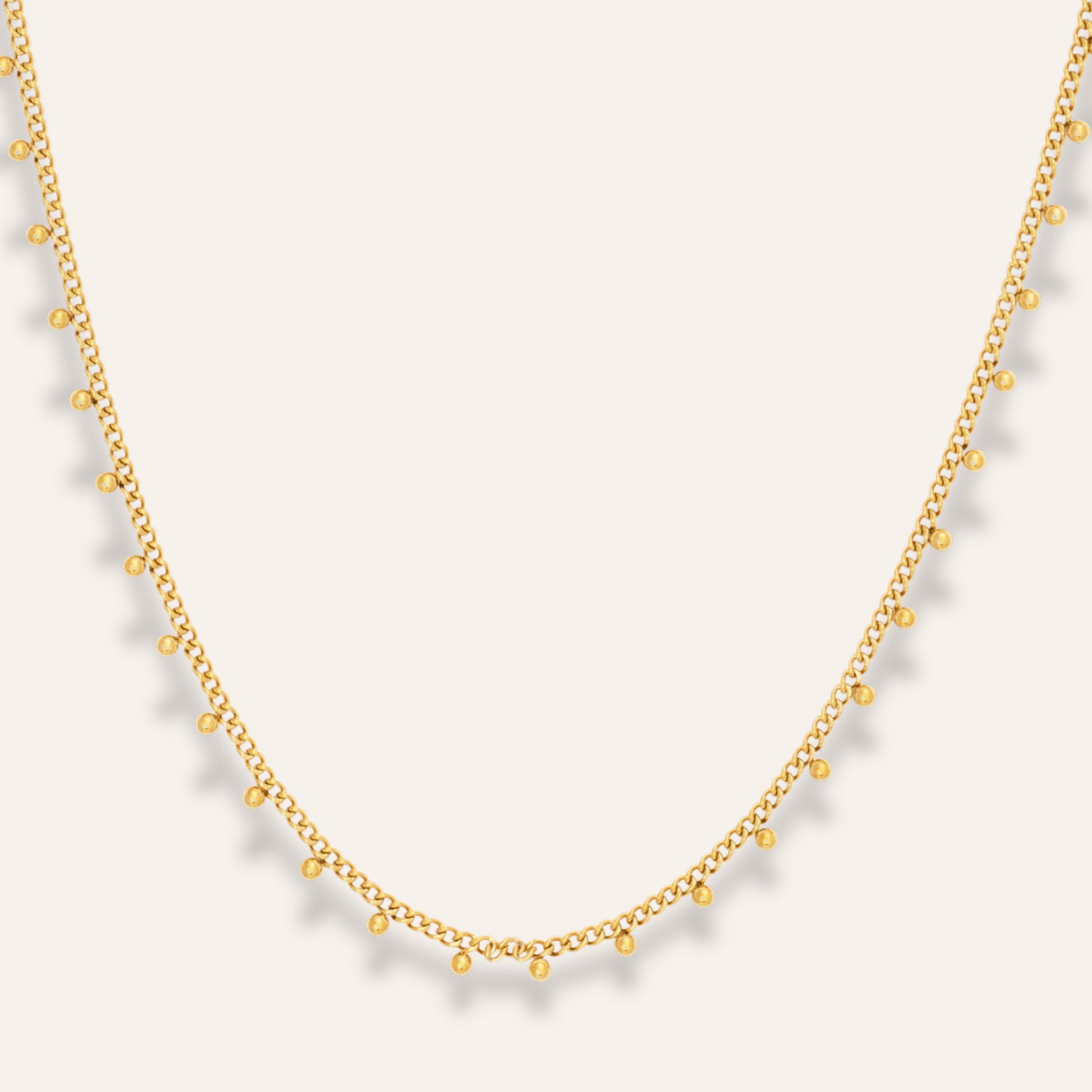 Tidlös elegans kommer till uttryck i detta stilrena halsband, tillverkat i högkvalitativt och vattentåligt rostfritt stål. Designen förhöjs av små dekorativa kulor som ger smycket en diskret och sofistikerad karaktär.