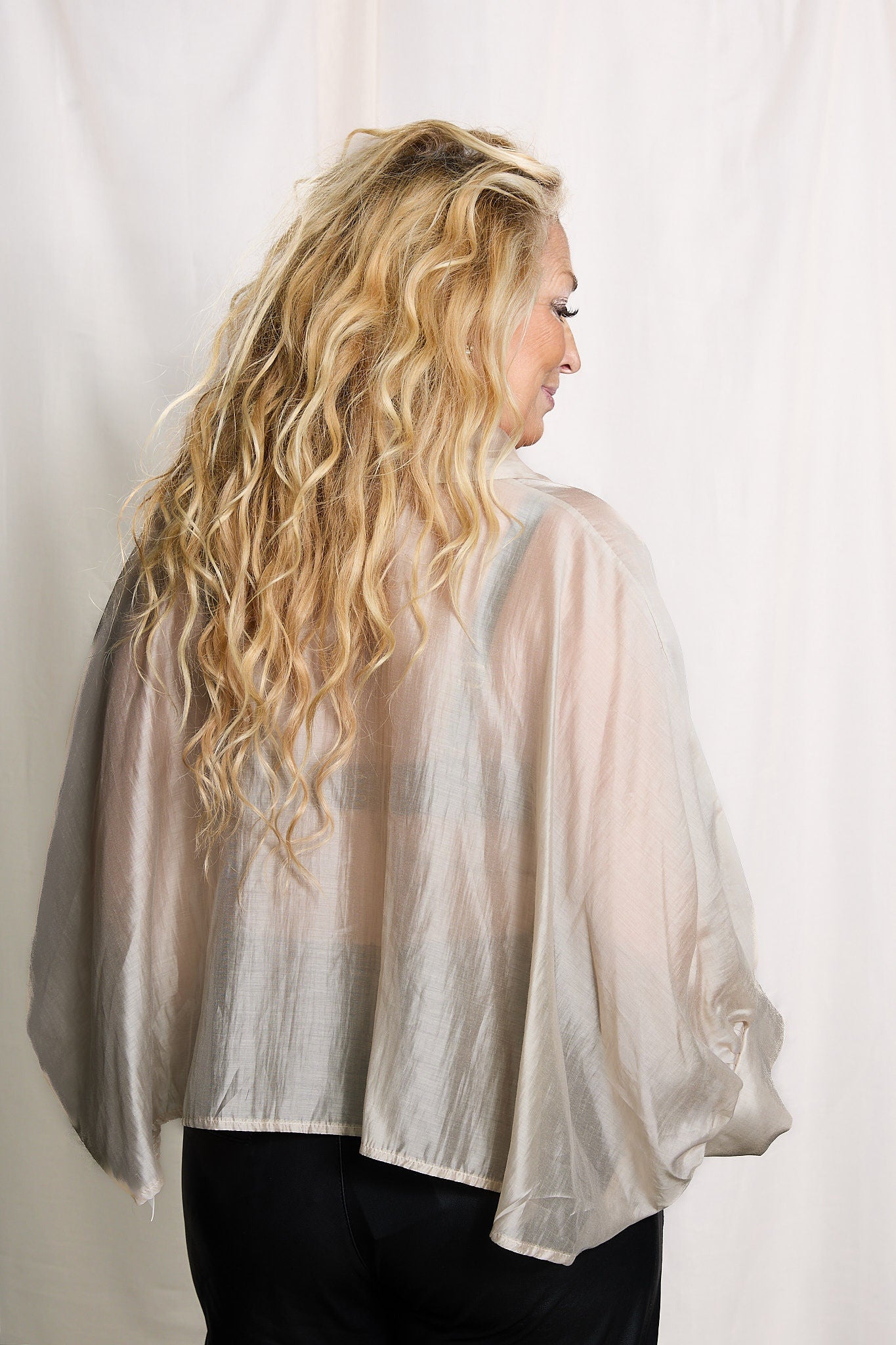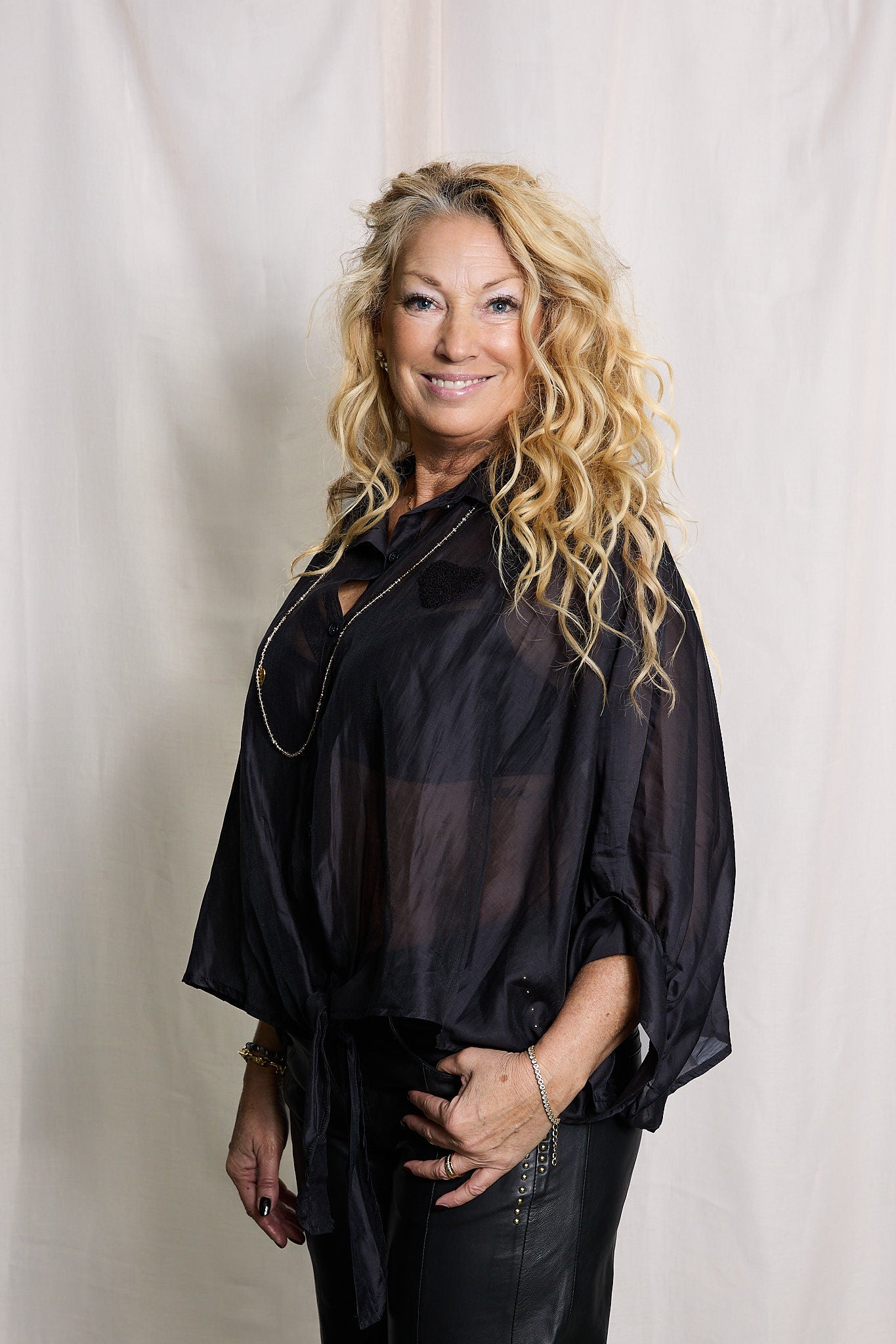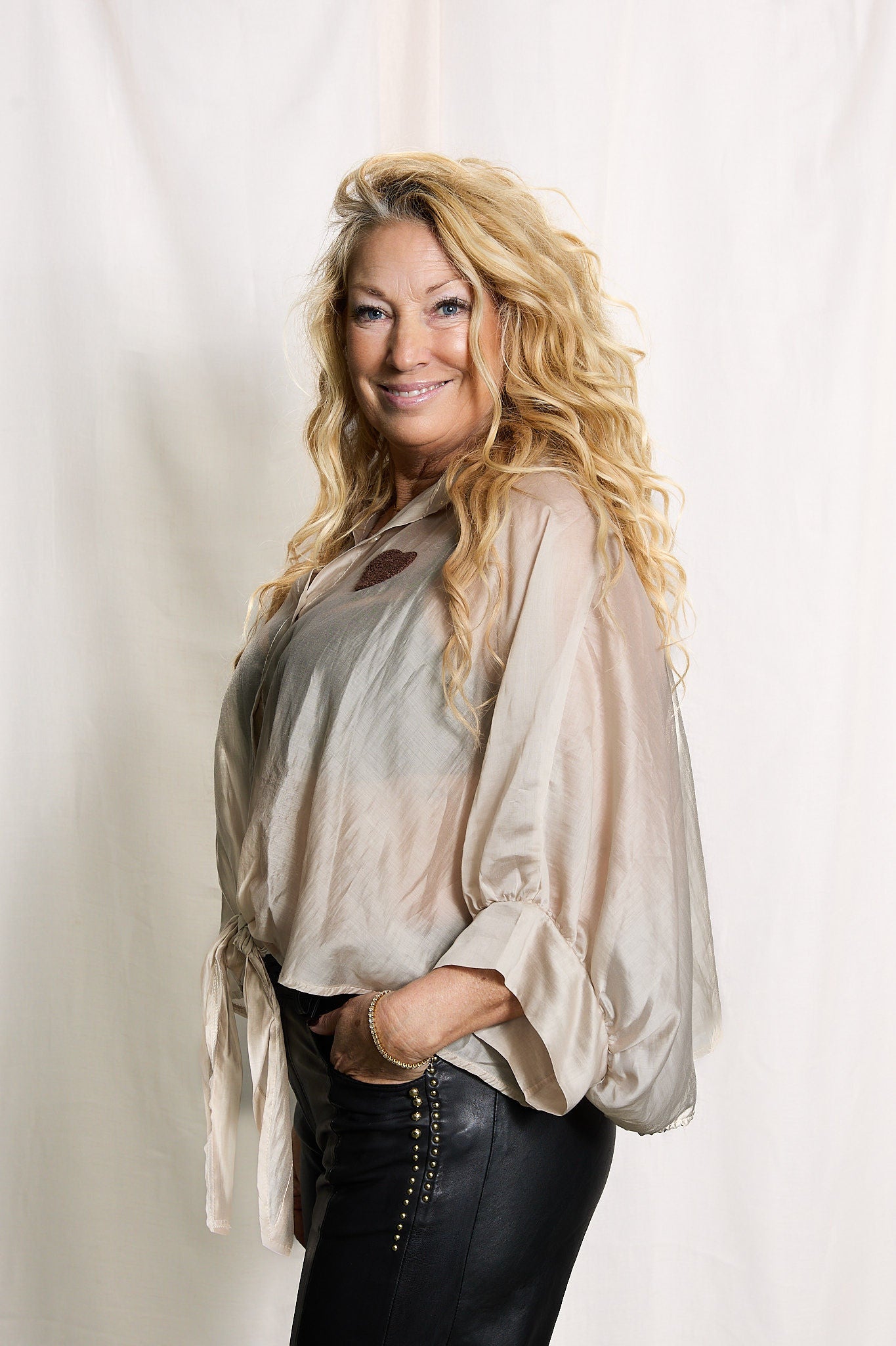 En feminin skjorta med trekvartsärm och en dekorativ knytdetalj framtill.