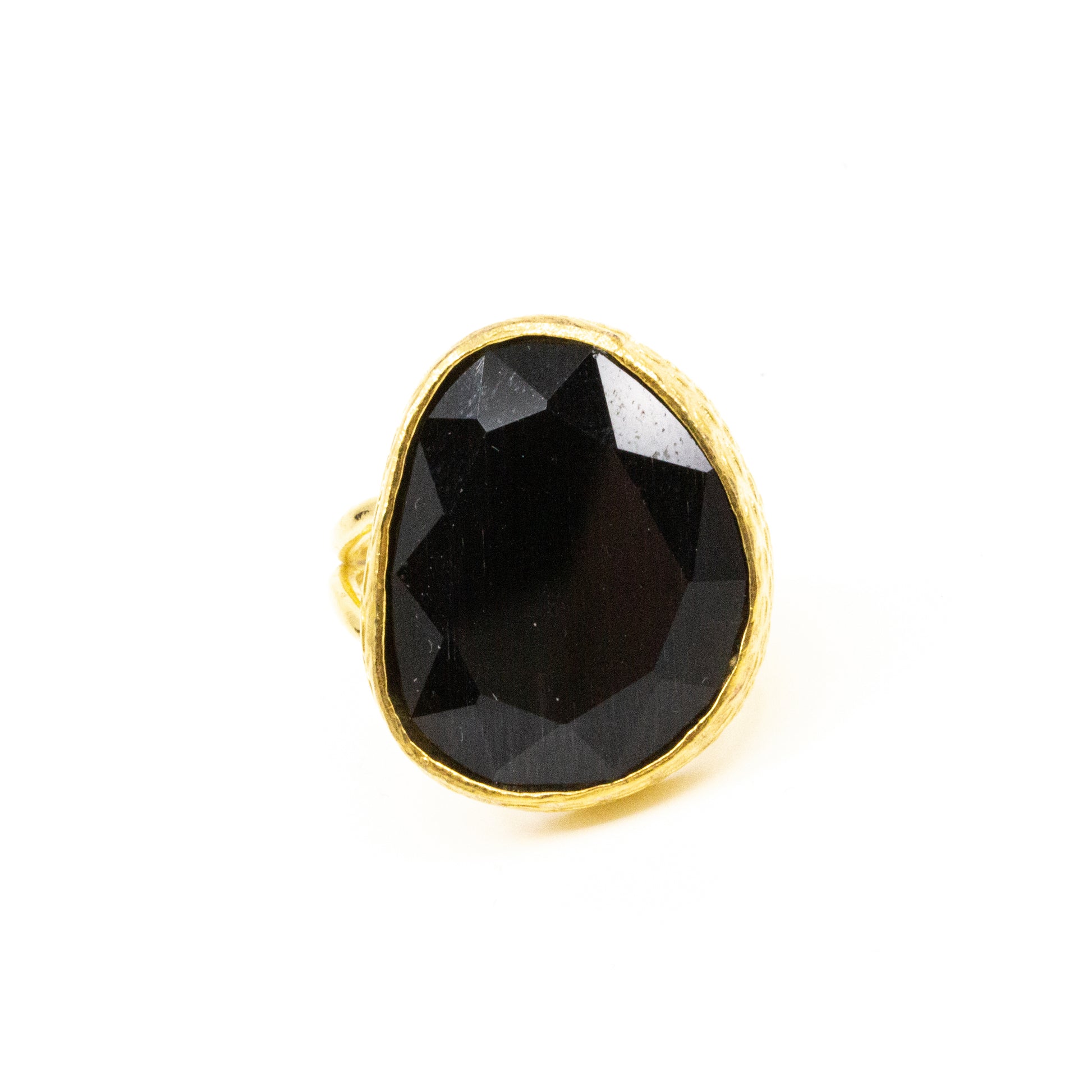 Handgjord ring med en stor, facettslipad kristall (20x25 mm) av syntetisk cat’s eye – skapad med en unik glasteknik. Ringen är tillverkad i mässing och förgylld med 24 karat guld. Justerbar för att passa de flesta.